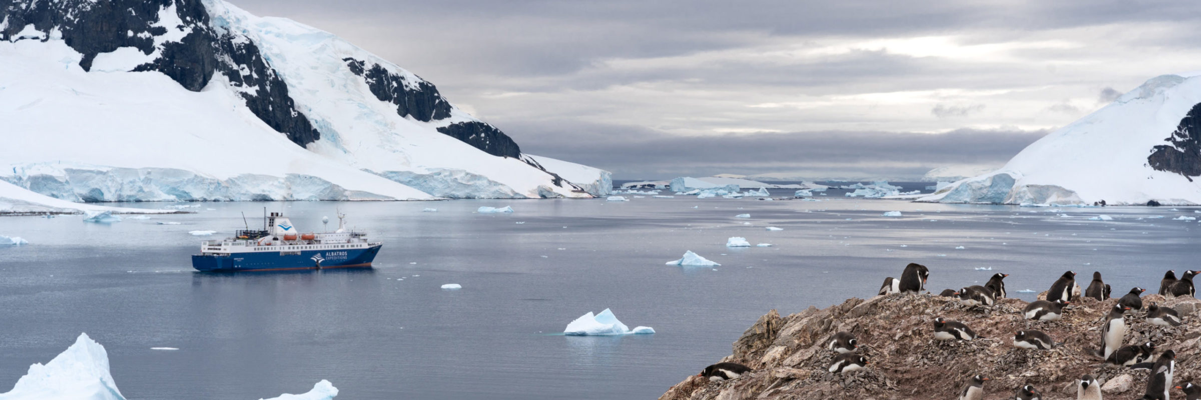 Auf 64 Grad südlicher Breite pflügt das Expeditionskreuzfahrtschiff durch das bleigraue Südpolarmeer, entlang vergletscherter, verschneiter Landschaften der Antarktis.