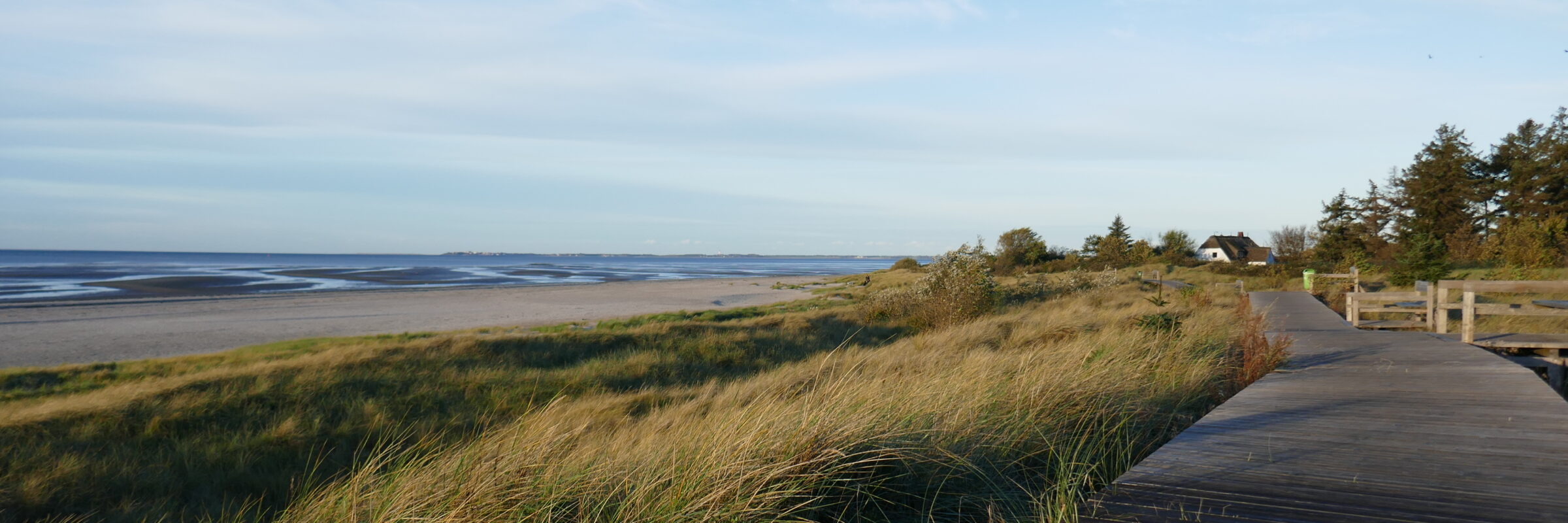 An diesem Morgen wird das frühe Aufstehen belohnt: Die Morgensonne taucht die Küste der Nordseeinsel Föhr in warmes, goldenes Licht. Sie legt ihre Strahlen über das blanke Watt, den Strand und das Dünengras. Ich schiebe das Rad über einen hölzernen Bohlenweg und kann mich von diesem Panorama kaum losreißen, vom Blick auf den scheinbar unendlichen Horizont, die Aussicht auf die Warften der gegenüber liegenden Hallig Langeneß, deren Silhouette gleich Maulwurfshügeln aus dem Wattenmeer ragt.